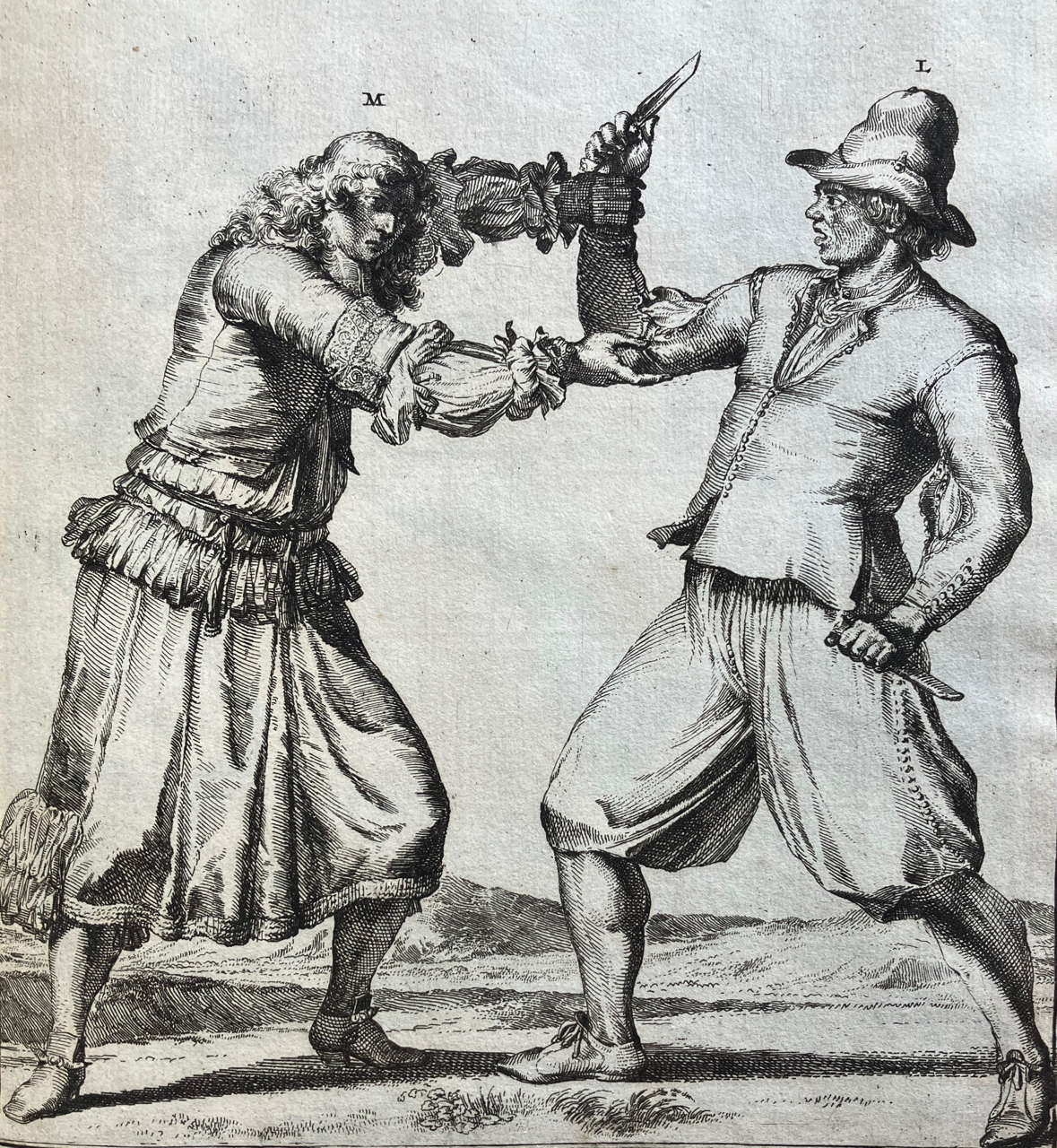 Simon Schama writes in The embarrassment of riches that Cors (the pupil and successor of Petter, the manager of a fighting academy who was formally the author of this book) exploited citizen's anxieties, especially in Amsterdam, about their vulnerability to violent assaults in cities and on highways. The great engraver Romeyn de Hooghe depicts different persons and alternates their outfits. In some cases the fight is among equals, in others a gentleman takes on a more proletarian agressor.