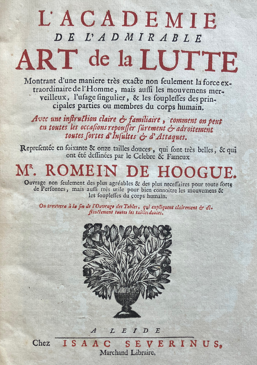 Hooghe, Romeyn de & (Petter, Nicolaes). L?Académie de l?admirable art de la lutte, Montrant d?une manière très exacte non seulement la force extraordinaire de l?Homme, mais aussi les mouvements merveilleux, l?usage singulier, & les souplesses des principales parties ou membres du corps humain. Avec une instruction claire & familière, comment on peut en toutes les occasions repousser sûrement & adroitement toutes sortes d?Insultes & d?Attaques. A Leide, Chez Isaac Severinus, [1712]. 4to (257 x 200 mm). 7 Leaves and 71 numbered plates in 13 sections.